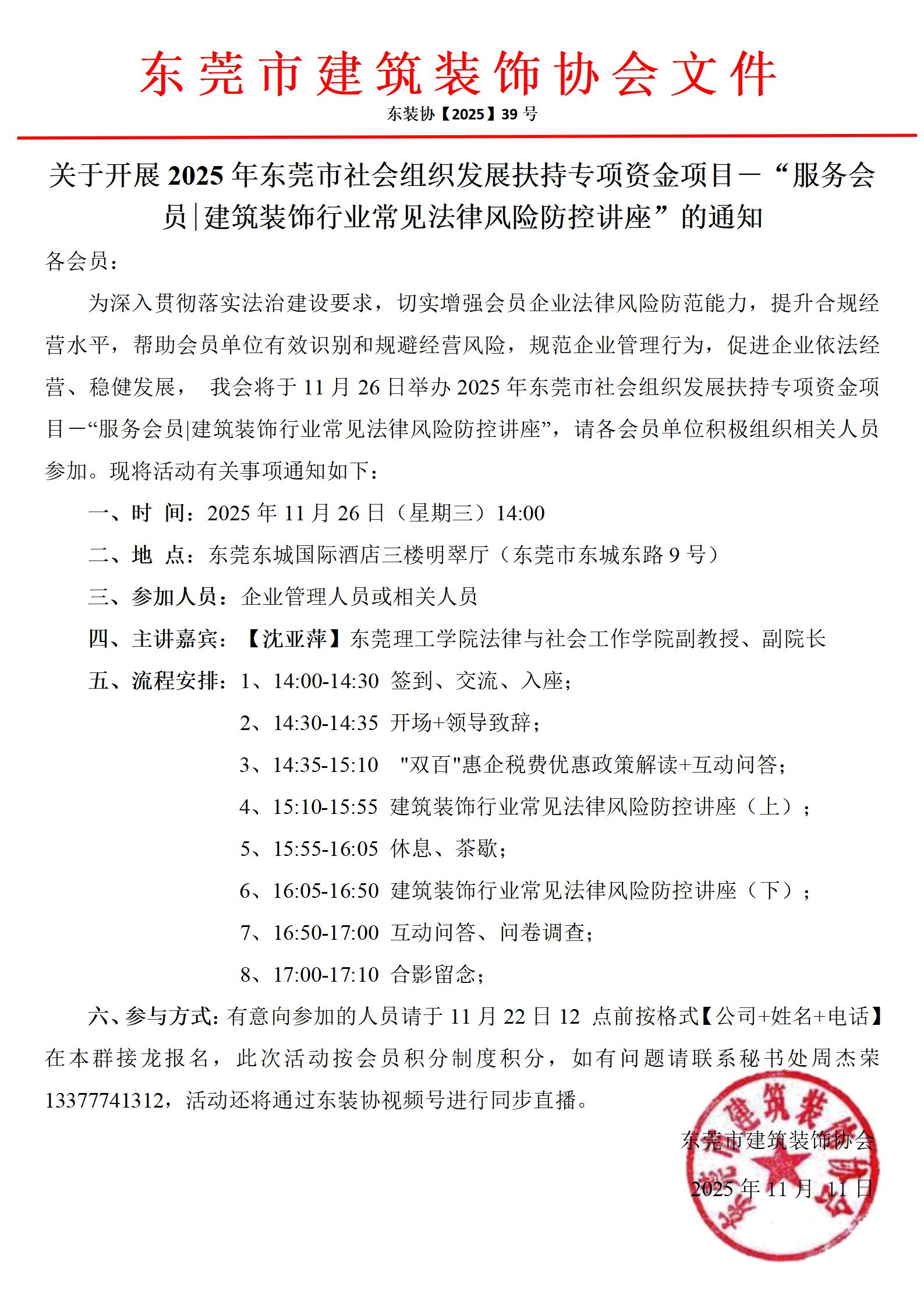 关于开展 2025年东莞市社会组织发展扶持专项资金项目一“服务会员|建筑装饰行业常见法律风险防控讲座”的通知