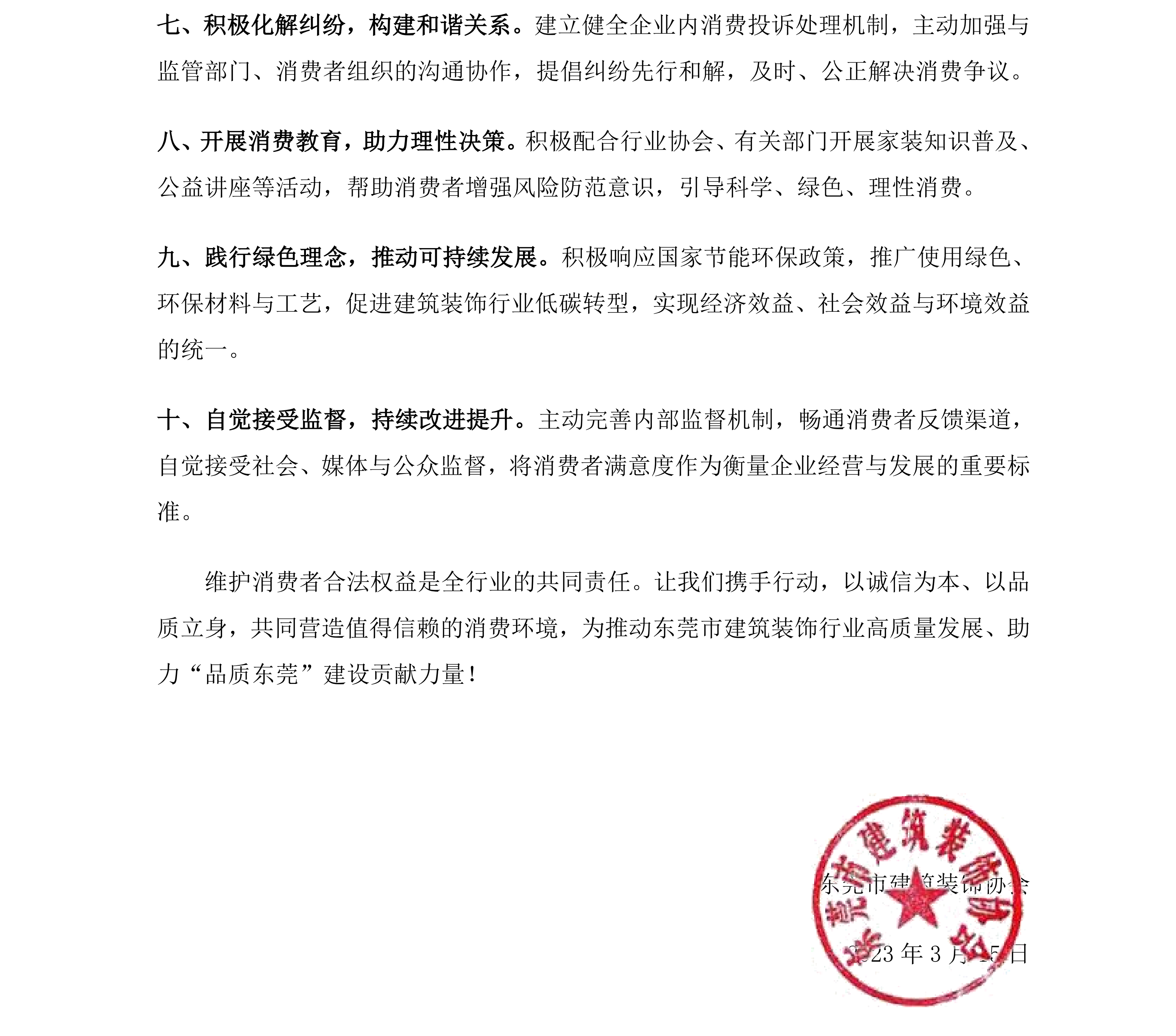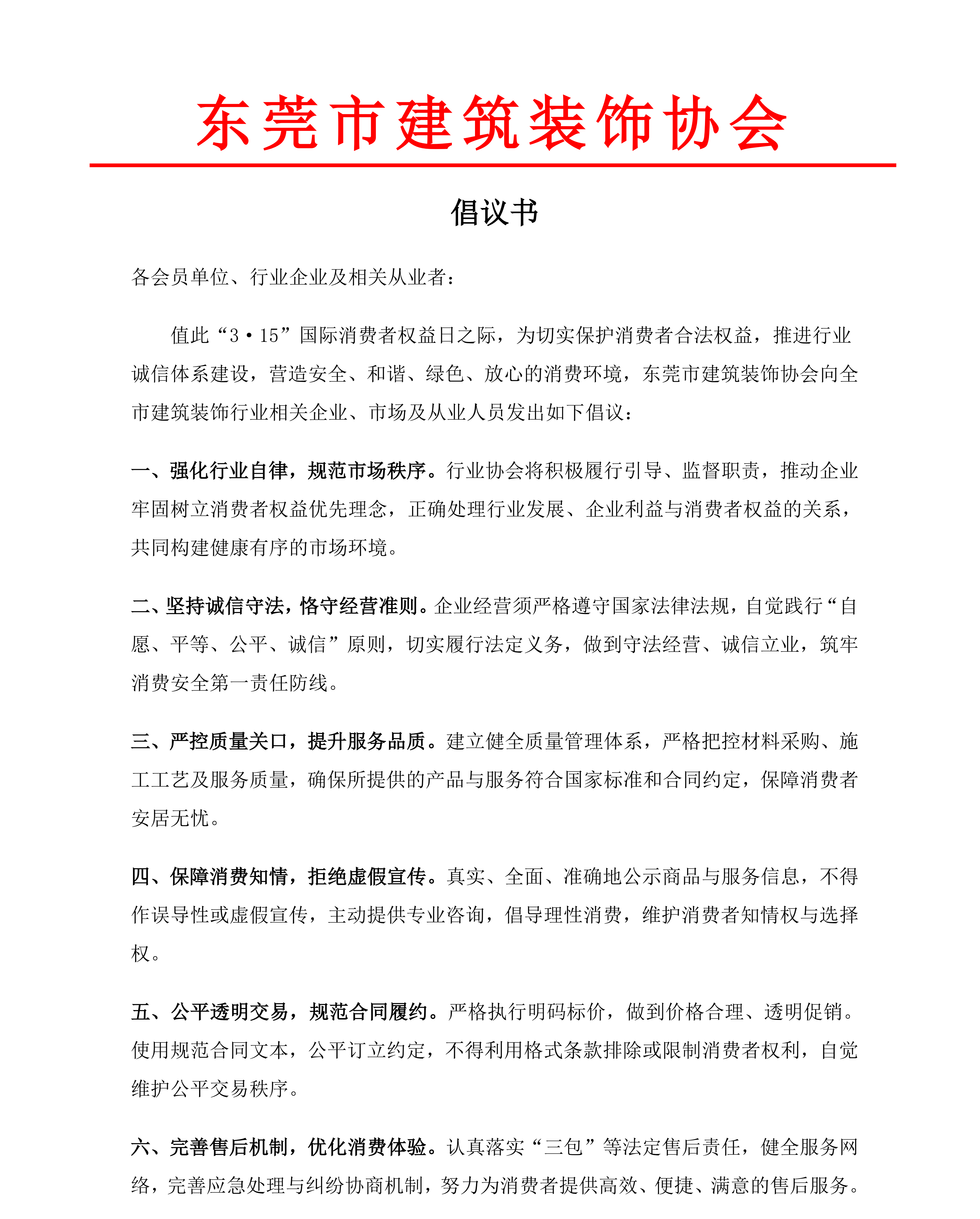 东莞市建筑装饰协会3.15消费者权益日倡议书