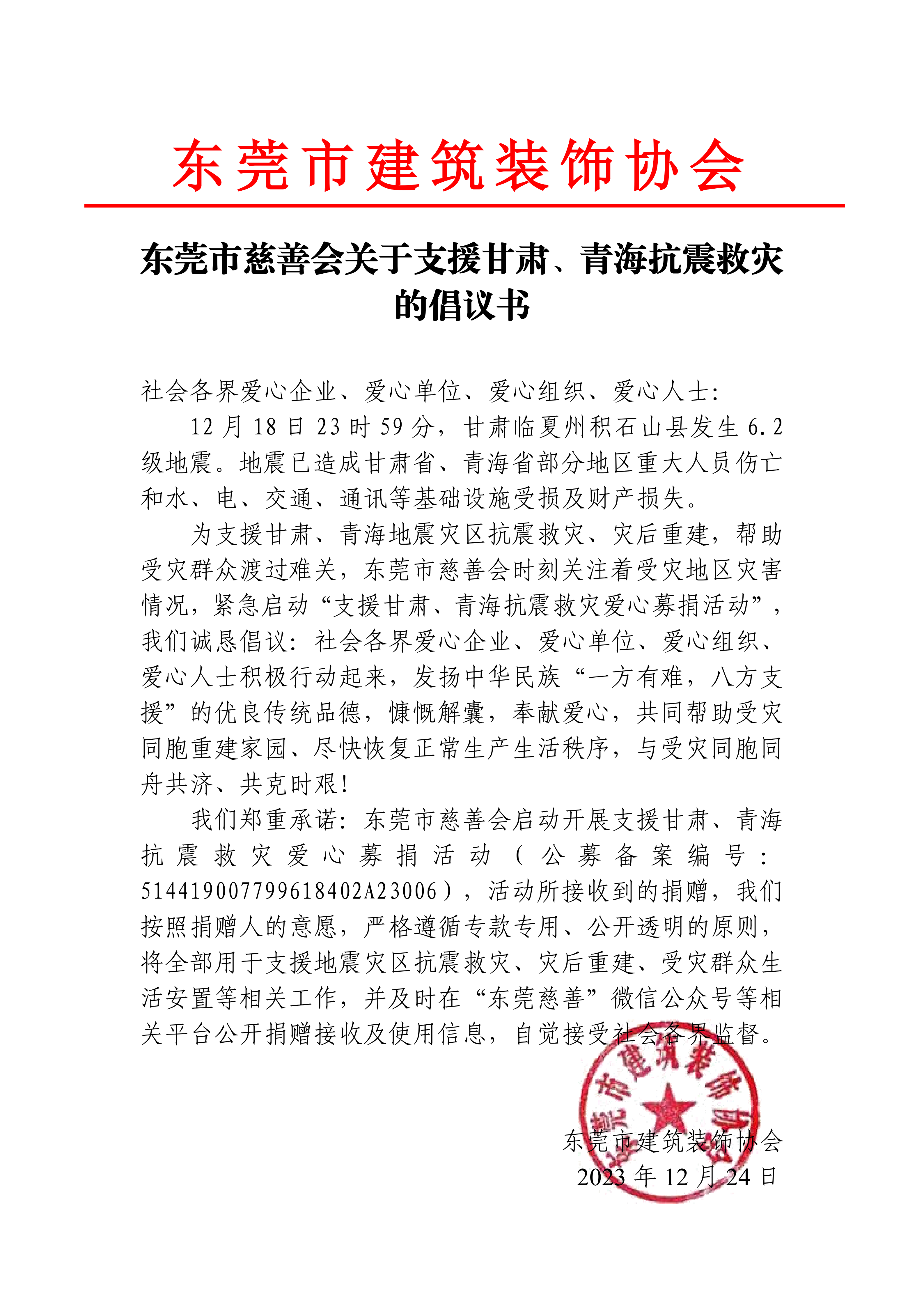 东莞市慈善会关于支援甘肃、青海抗震救灾的倡议书