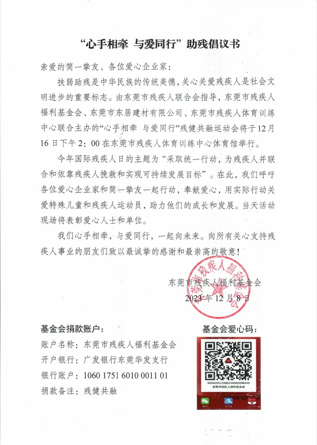 您的善行义举将在12月16日"心手相牵 与爱同行"残健共融运动会上获得表彰。让我们汇聚爱心力量,传递社会温暖,共建健康和谐社会!