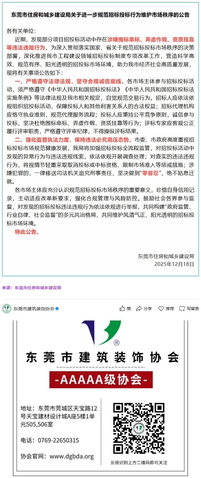 【转发通知】东莞市住房和城乡建设局关于进一步规范招标投标行为维护市场秩序的公告